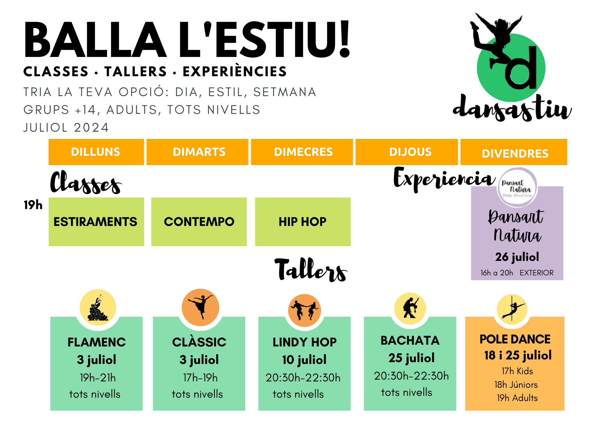 Però això no és tot, durant tot juliol podràs gaudir de TALLERS intensius de bachata, lindy hop, flamenc, neoclàssic, pole dance i més!
