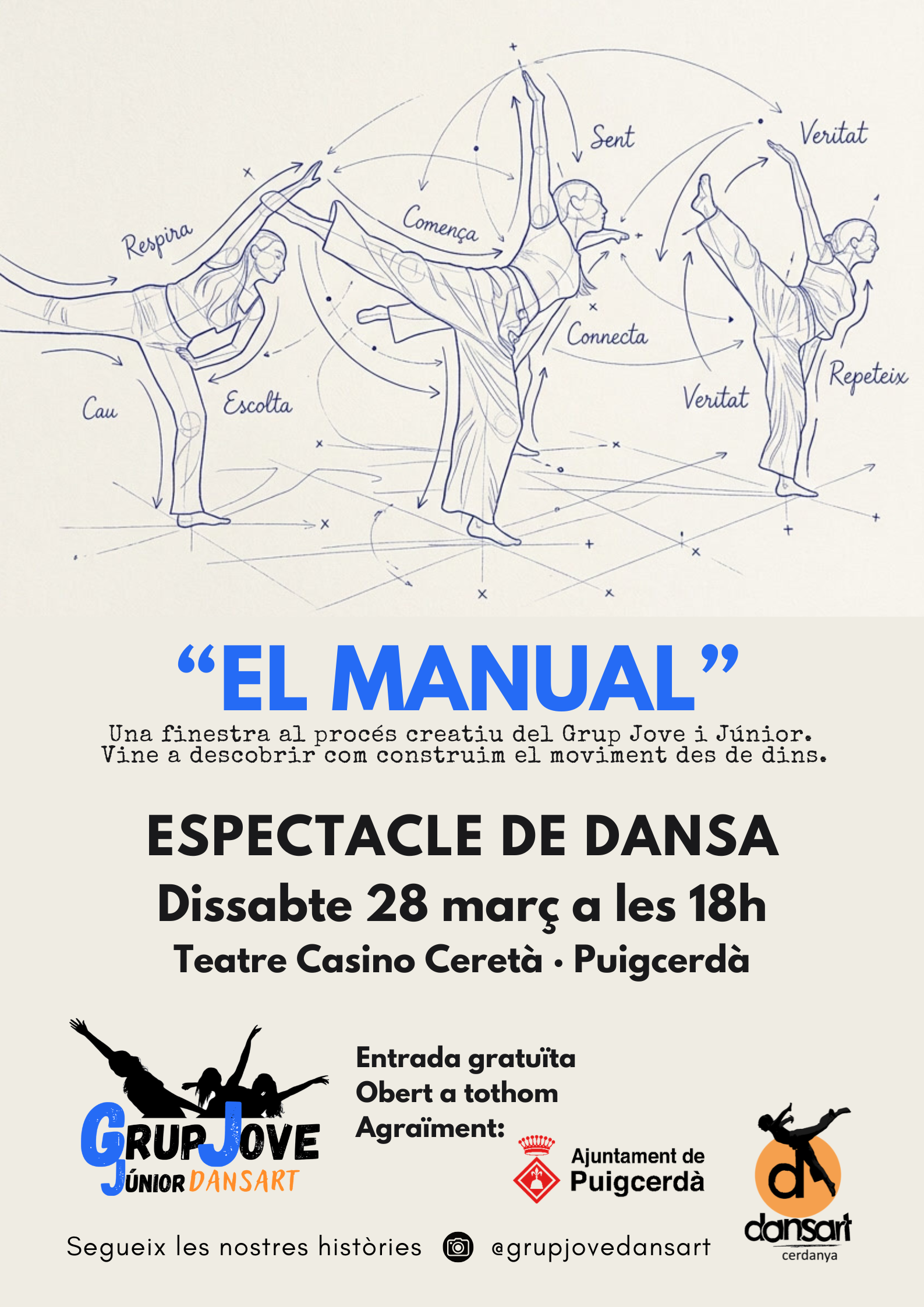 El proper dissabte 28 de març a les 18:00 h, el Teatre Casino Ceretà de Puigcerdà acollirà la mostra anual del Grup Jove i el Grup Júnior de l’Escola Dansart. Sota el títol "EL MANUAL", les ballarines presenten un Working Progress que fuig dels formats tancats per mostrar la dansa com un llenguatge viu, humà i en construcció constant.